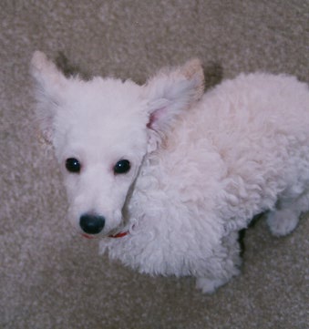 Mr. Jingles was a 1999 Christmas present from Becky's mom. He is a toy poodle but dreams of an upgrade to a larger class. He is a very friendly dog. His hobbies are chewing pig ears and Homer's head. He stands a height of 1 foot 7 inches tall and weights 7.25 lbs. His birthday is October 12, 1999. (Please don't make fun of his ears, he's very sensitive.)